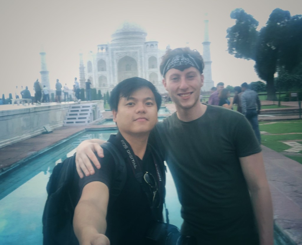 Tôi định sẽ gặp một bạn người Ấn có hẹn qua Couchsurfing khi đến Agra nhưng nhận được tin nhắn từ Dean, tôi quyết định sẽ đi du lịch cùng. Chúng tôi cùng đến Agra trong buổi tối ngày 23/09 bằng xe khách, nhưng chọn nghỉ ở khác Hostel – đều gần Taj Mahal. Sáng sớm đó Dean đến chổ tôi như đã hẹn, chúng tôi cùng nhau đi bộ đến ngắm Taj Mahal..