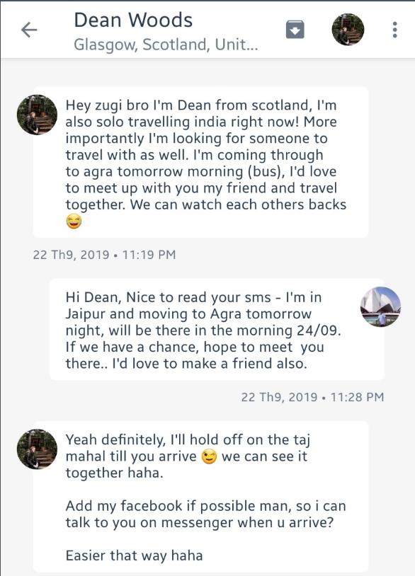 Tôi nhận được tin nhắn từ Couchsurfing – một anh bạn cũng đi du lịch một mình như tôi cũng chuẩn bị đi đến Thành Phố Agra và muốn hẹn đi ngắm bình minh Taj Maha cùng nhau.